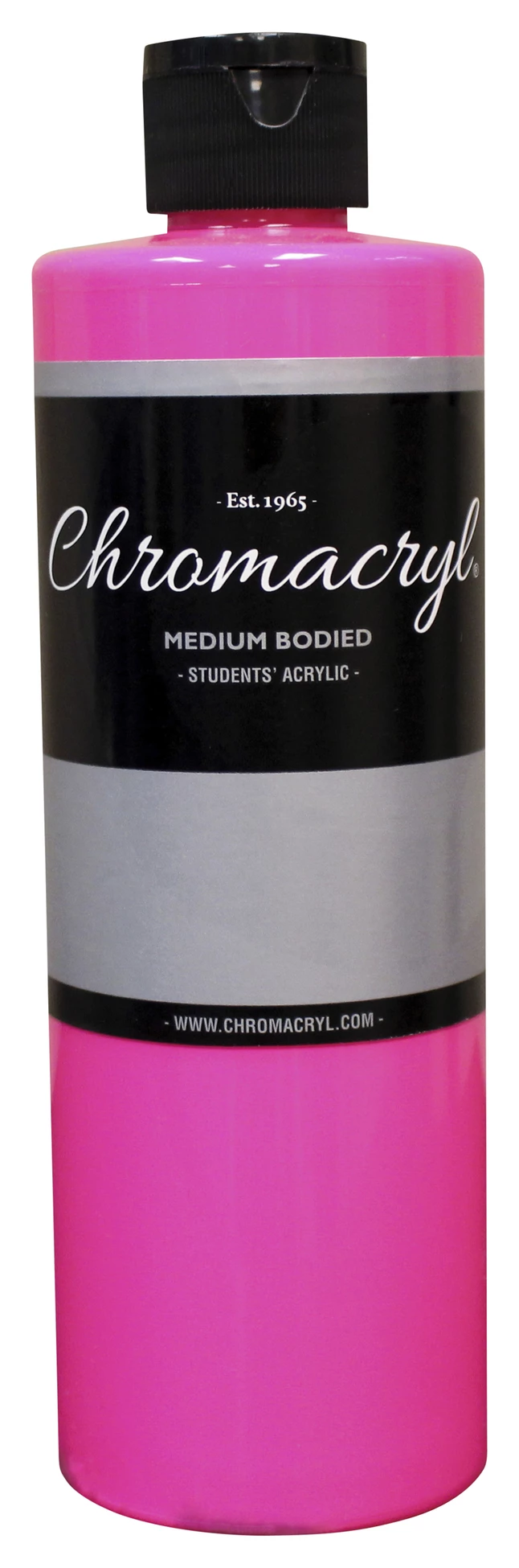 Chromacryl Students Acrylic Paint in neon Pink comes in a bottle of capacity 1 pt and is non-toxic. Paint that is creamy and intermixable cleans up with soap and water easily. Paint finds its application from finger painting to fine art, silk screening to block printing and construction paper to textiles. Paint dries flexible and does not settle in the container eliminating the need for shaking before use. Freeze/thaw stable acrylic paint allows you to move from one technique to another without changing paints and is compatible with all Chroma acrylic mediums. (Test first with other brands.)