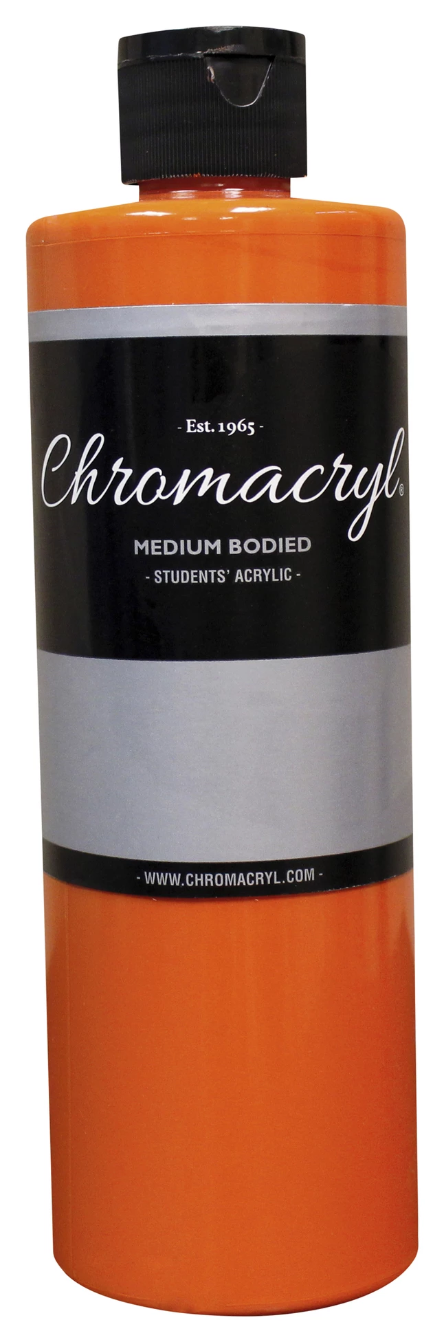 Chromacryl Students Acrylic Paint in Orange comes in a bottle of capacity 1 pt and is non-toxic. Paint that is creamy and intermixable cleans up with soap and water easily. Paint finds its application from finger painting to fine art, silk screening to block printing and construction paper to textiles. Paint dries flexible and does not settle in the container eliminating the need for shaking before use. Freeze/thaw stable acrylic paint allows you to move from one technique to another without changing paints and is compatible with all Chroma acrylic mediums. (Test first with other brands.)