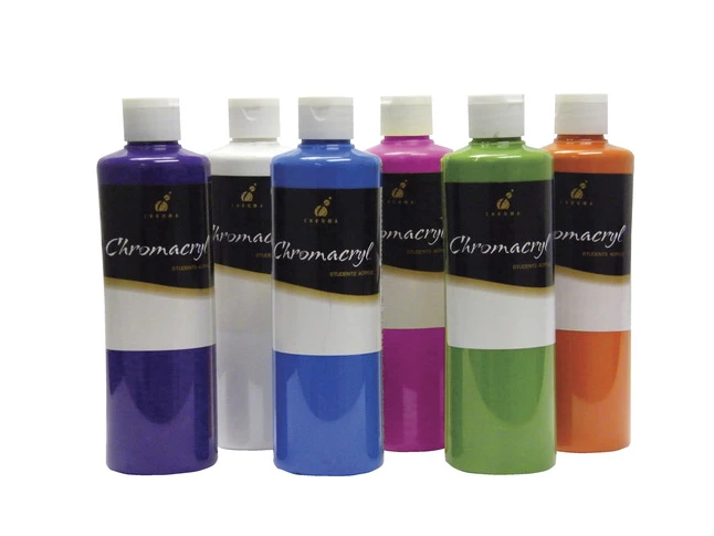 Chromacryl Student’s Acrylic Paint Set in assorted colors comespint containers. This bright set includes Violet, Orange Vermilion, Cobalt Blue, White, Magenta and Green Light. Freeze/Thaw stable.