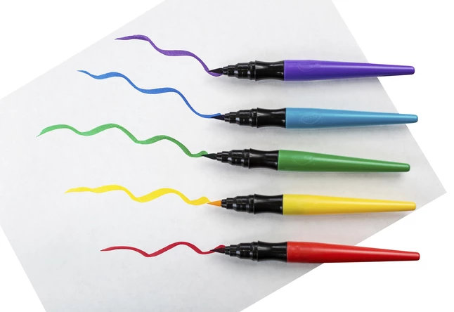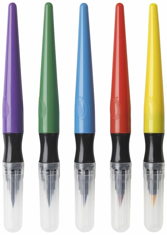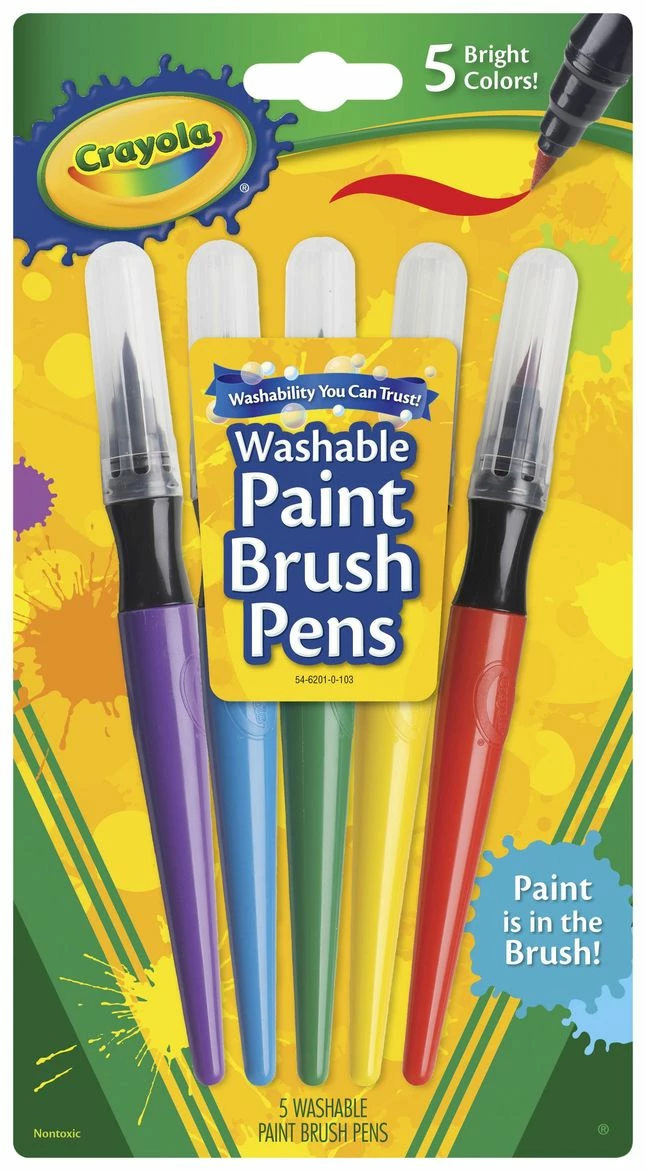 Crayola No Drip Paint Brush Pen Set in assorted bright colors wash easily from skin and almost all clothing. Non-Toxic pen set having 5 pens features a unique design that delivers a smooth flow of paint and requires no squeezing. Sold as 5 per set.