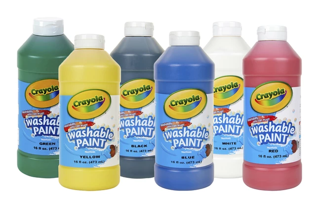 Crayola Washable Tempera Paint Set in 6 assorted colors come in containers of 1 pt capacity each. This paint set includes colors such as red, yellow, blue, green, black and white.
