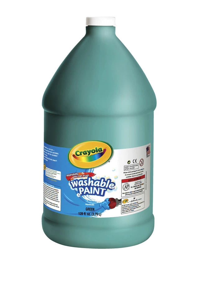Enhance any artwork with Crayola Washable Paint in Green. Thick gel consistency provides rich color (and thorough covering), while still being able to be easily washed away from skin and almost all clothing/fabric. Paint dries to a matte finish, is free thaw stable, and does not separate. Comes in a one gallon plastic jug with screw lid.