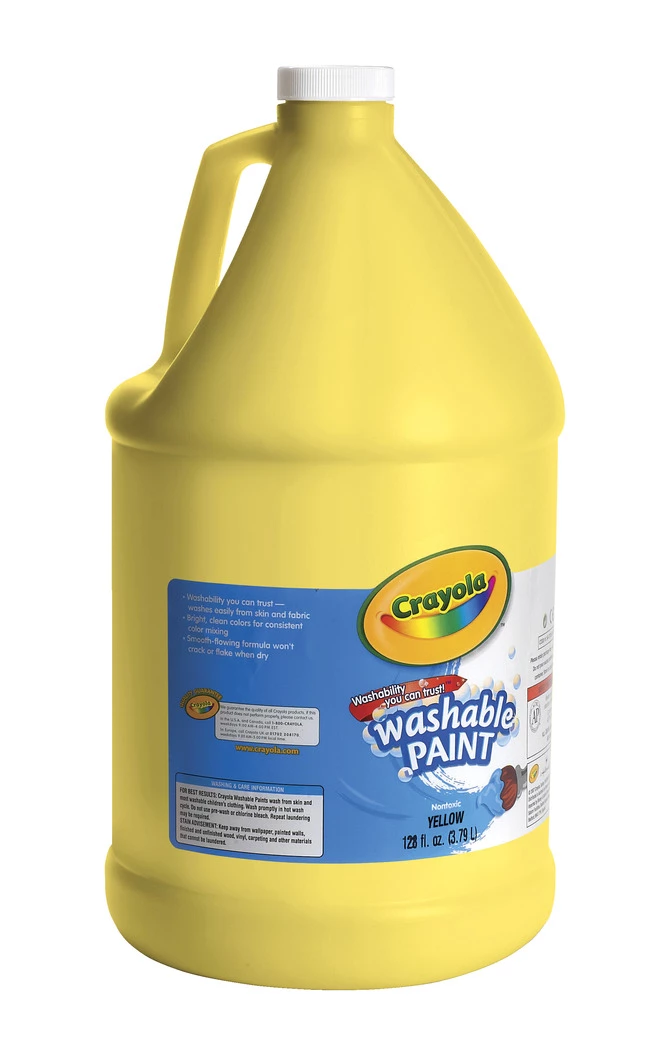 Enhance any artwork with Crayola Washable Paint in Yellow. Thick gel consistency provides rich color (and thorough covering), while still being able to be easily washed away from skin and almost all clothing/fabric. Paint dries to a matte finish, is free thaw stable, and does not separate. Comes in a one gallon plastic jug with screw lid.