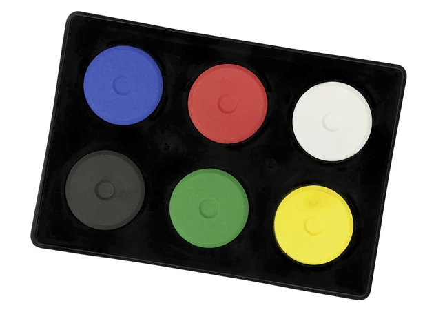 6 assorted colors of blue, yellow, red, green, black and white is a convenient source of brilliant color. Each cake measures 1-5/8 in x 5/16 in. Intermediate hues can be got by mixing different colors. It is ideal for distribution or collection activities in the classroom. Tempera cake can be instantly used with the addition of water and does not deteriorate in storage. Sold as 6 per set.
