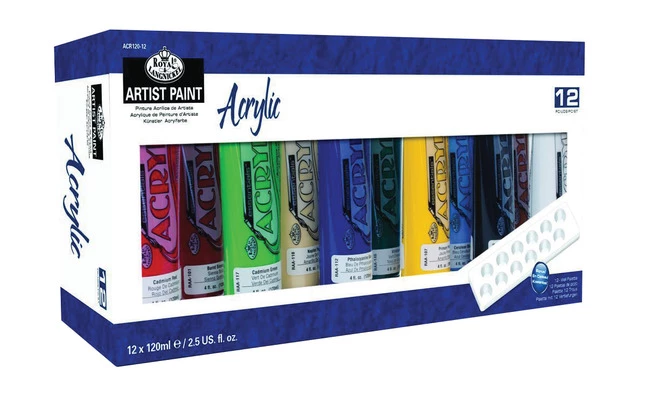 Royal Brush Artist Acrylic Paint is highly pigmented and easy to work on almost any surface. Paint set includes a dozen inter-mixable 4 ounces (120 ml) creamy colors of naphthalene carmine, cadmium red, cadmium orange, primary yellow, cadmium green, dark green, primary cyan, violet, raw sienna, burnt umber, mars black and titanium white along with a pop-up top. Sold as 12 per pack.